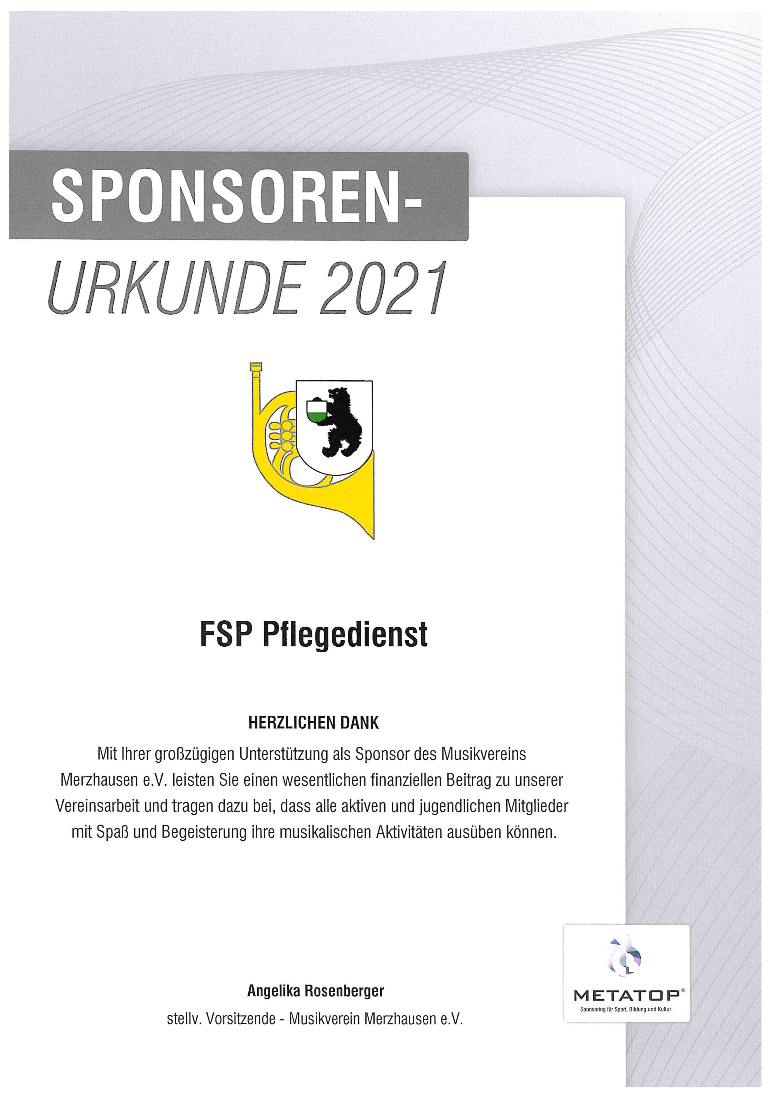 Als Dankeschön für unsere Unterstützung hat uns der Verein eine Sponsorenurkunde für das Jahr 2021 überreicht.