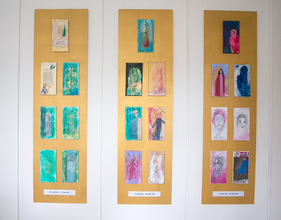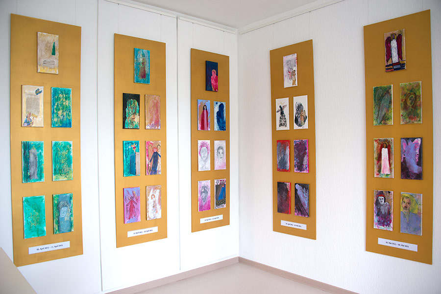 Täglich werden in unseren Räumen weitere Tafeln mit jeweils 7 Engeln aufgehängt. Das ist auch gut so, denn die Ausstellung 365 Engel wird schon bald, am 29.12.2015 eröffnen. Gleichzeitig malt die Künstlerin Barbara Leitner täglich weiter an den letzten Engelsbildern. Am 23.12.2015 ist das Projekt beendet und dann werden 365 Engel das Licht dieser Welt erblickt haben. Die Wirkung der Tafeln mit den Engelsbildern ist wirklich sehr beeindruckend. Um Ihnen einen kleinen Eindruck von der Ausstellung zu geben, zeigen wir ihnen hier schon einmal zwei Fotos der Ausstellung. Viel Spaß beim Anschauen und hoffentlich bis bald.